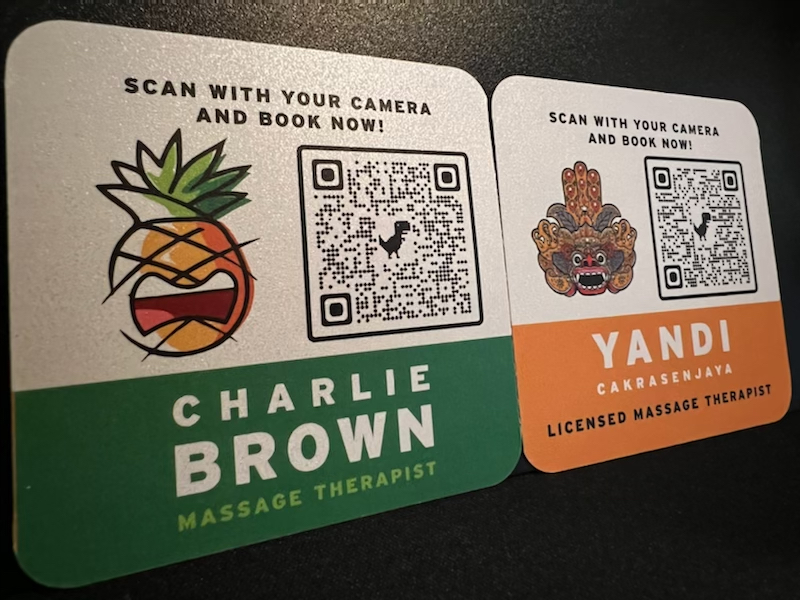 Pearlescent rounded square business cards with the QR code on the back to quickly get an appointment in with ease. The simplification of setting up an appointment has made it easier for both clients and customers.