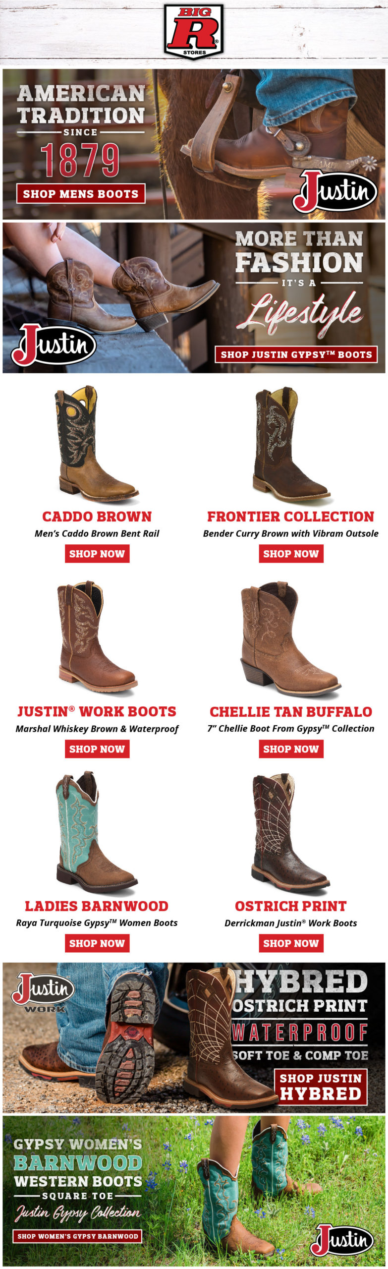 Vendor Specific E-mail campaigns for Justin Boots, Keen, and Carhartt.