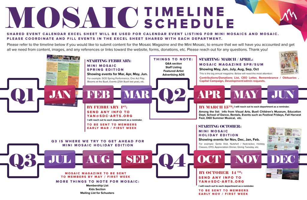 From the hectic schedule with juggling four departments in the campus, this was distributed internally, albeit always a work in progress. This is to emphasize the timeline and the content needed to ensure it will be in the mosaic in time for the publication to be sent to members.